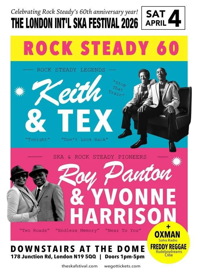 'Rock Steady 60' celebrates the 60th anniversary year of rock steady, with some true legends of the era - Keith & Tex and Roy Panton & Yvonne Harrison. Plus your host DJ for the afternoon, London’s very own - Oxman (Soho radio / Soul Jazz sound system / Dub Vendor) and from Berlin Boss Weekender - Freddy Reggae.